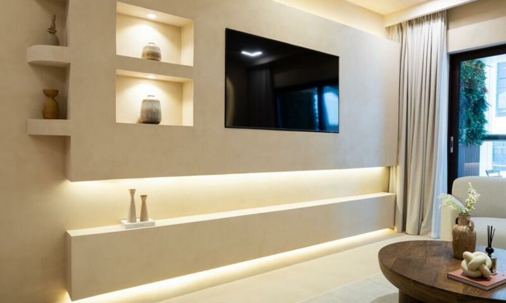 Appartement d’une chambre de 89 m², entièrement rénové dans un style moderne et raffiné. Les finitions en béton ciré, l’éclairage indirect et les lignes épurées créent une atmosphère élégante et contemporaine. La chambre offre une ambiance chaleureuse avec un éclairage intégré et un design sur mesure. La salle de bain offre un confort haut de gamme avec sa douche à l’italienne et sa double vasque. L’espace de vie lumineux et spacieux s’ouvre sur un balcon avec vue sur Pal Jumeirah et la mer. Située dans le quartier animé et recherché de Dubaï Marina, cette propriété allie parfaitement esthétique et fort potentiel locatif, au sein d’une résidence emblématique.